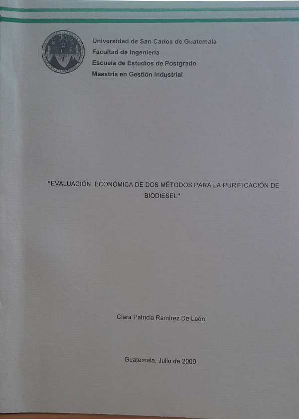 Evaluación económica de dos métodos para la purificación de biodiesel / Ramírez De León, Carla Patricia