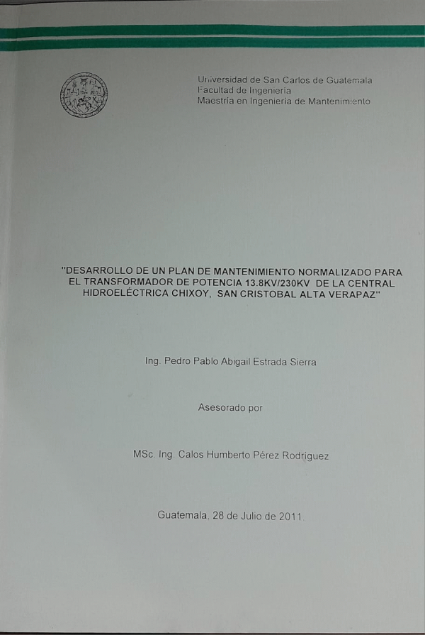 Desarrollo de un plan de mantenimiento normalizado para el transformador de potencia 13.8KV/230KV de la central hidroeléctrica Chixoy, San Cristobal Alta Verapaz / Estrada Sierra, Pedro Pablo Abigail