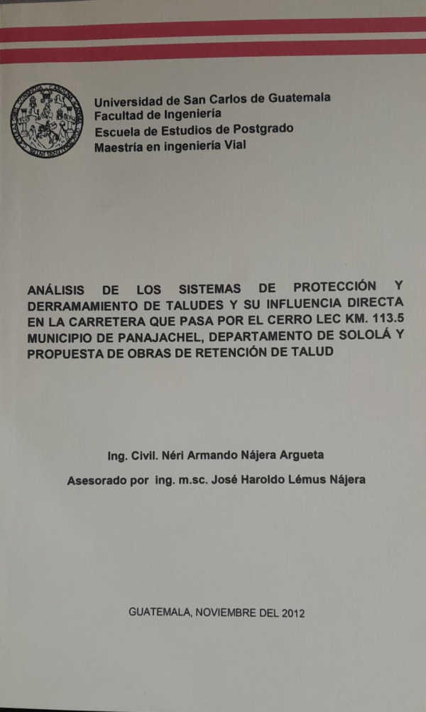 Análisis de los sistemas de protección y derramamiento de taludes y su influencia directa en la carretera que pasa por el cerro Lec Km. 113.5 municipio de Panajachel, departamento de Sololá y propuesta de obras de retención de talud / Nájera Argueta, Néri Armando