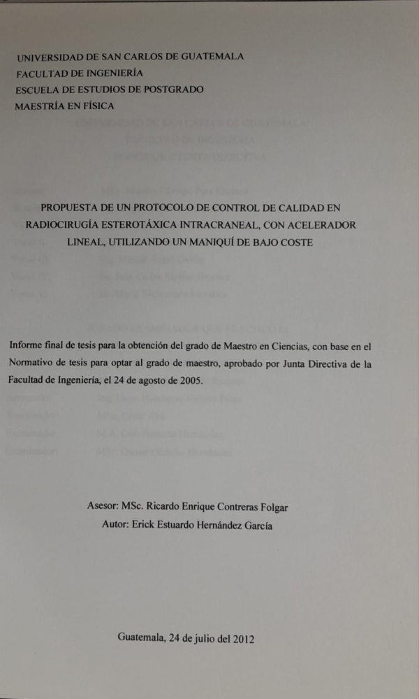 Propuesta de un protocolo de control de calidad en radiocirugía esterotáxica intracraneal, con acelerador lineal, utilizando un maniquí de bajo coste / Hernández García, Erick Estuardo.-
