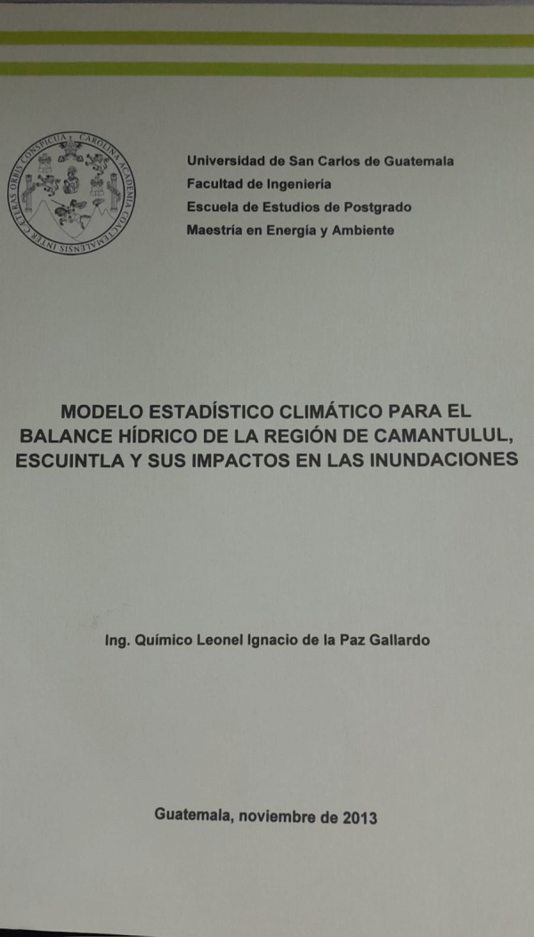 Modelo estadístico climático para el balance hídrico de la región de Camantulul, Escuintla y sus impactos en las inundaciones / de la Paz Gallardo, Leonel Ignacio.-