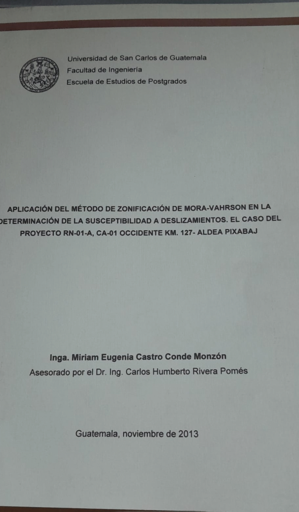 Aplicación del método de zonificación de Mora-Vahrson en la determinación de la susceptibilidad a deslizamientos : El caso del proyecto RN-01-A, CA-01 occidente Km. 127 - Aldea Pixabaj / Castro Conde Monzón, Miriam Eugenia