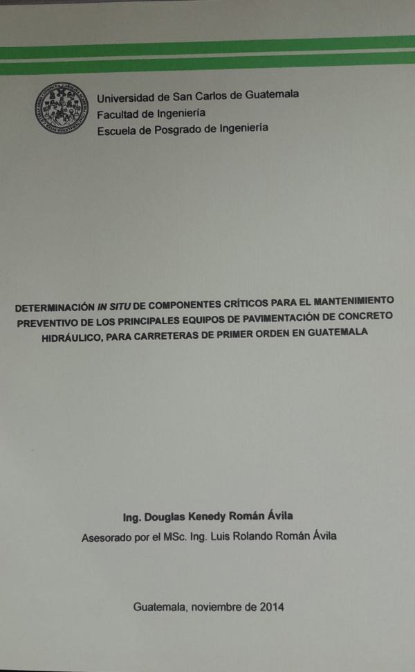 Determinación in situ de componentes críticos para el mantenimiento preventivo de los principales equipos de pavimentación de concreto hidráulico, para carreteras de primer orden en Guatemala / Román Ávila, Douglas Kenedy