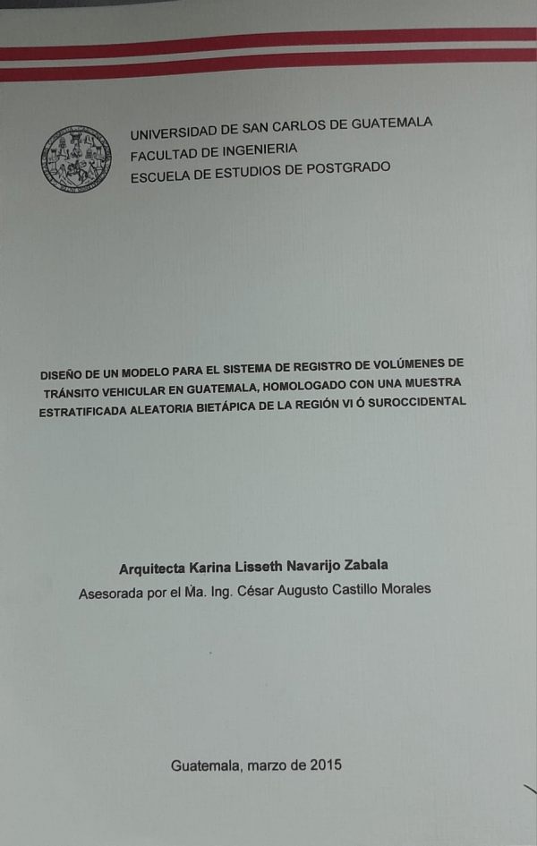 Diseño de un modelo para el sistema de registro de volúmenes de tránsito vehicular en Guatemala, homologado con una muestra estratificada aleatoria bietápica de la región VI ó suroccidental / Navarijo Zabala, Karina Lisseth
