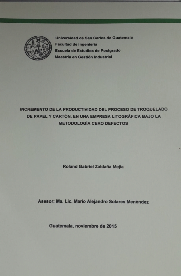 Incremento de la productividad del proceso de troquelado de papel y cartón, en una empresa litográfica bajo la metodología cero defectos / Zaldaña Mejía, Roland Gabriel