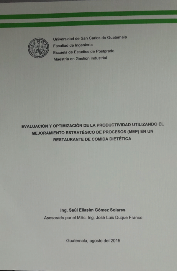 Evaluación y optimización de la productividad utilizando el mejoramiento estratégico de procesos (EMP), en un restaurante de comida dietética / Gómez Solares, Saúl Eliasim