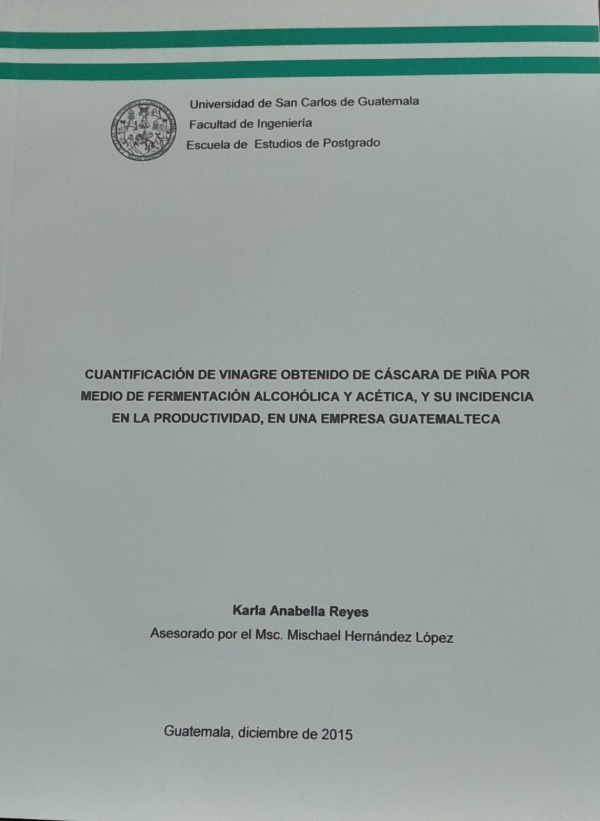 Cuantificación de vinagre obtenido de cáscara de piña por medio de fermentación alcohólica y acética, y su incidencia en la productividad, en una empresa guatemalteca / Reyes, Karla Anabella