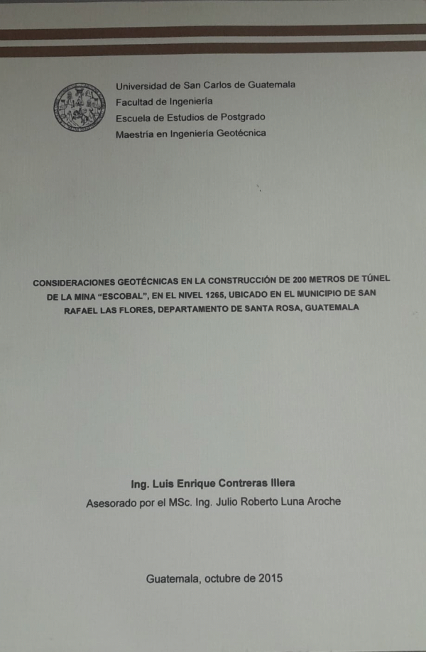 Consideraciones geotécnicas en la construcción de 200 metros de túnel de la mina ¨Escobal¨, en el nivel 1265, ubicado en el municipio de San Rafael Las Flores, departamento de Santa Rosa, Guatemala / Contreras Illera, Luis Enrique