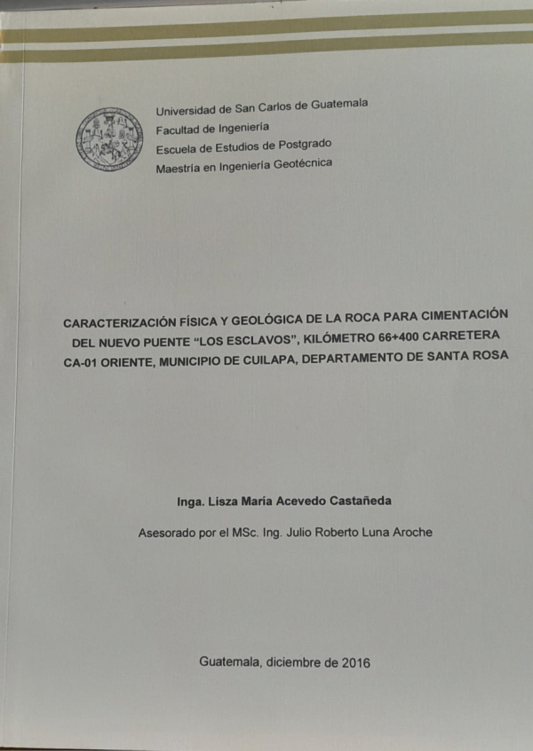 Caracterización física y geológica de la roca para cimentación del nuevo puente ¨Los Esclavos¨, kilómetro 66+400 carretera CA-01 Oriente, municipio de Cuilapa, departamento de Santa Rosa / Acevedo Castañeda, Lisza María