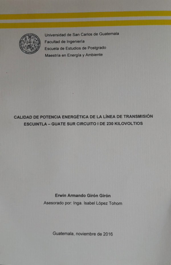 Calidad de potencia energética de la línea de transmisión Escuintla - Guate Sur circuito I de 230 Kilovoltios / Girón Girón, Erwin Armando