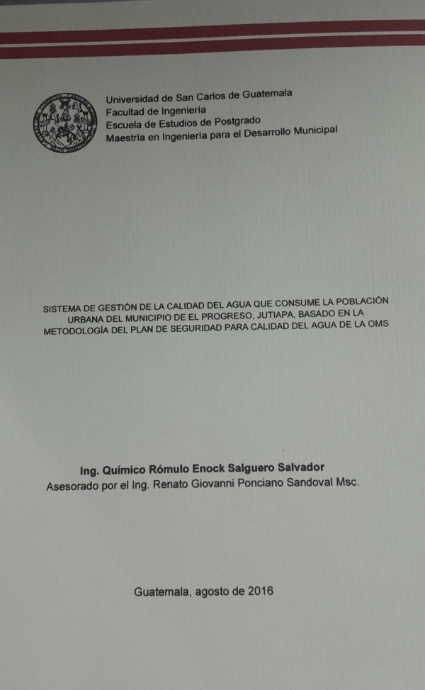 Sistema de gestión de la calidad del agua que consume la población urbana del municipio de El Progreso, Jutiapa, basado en la metodología del plan de seguridad para calidad del agua de la OMS / Salguero Salvador, Rómulo Enock