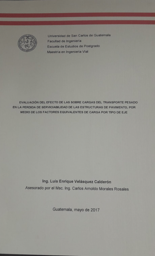 Evaluación del efecto de las sobre cargas del transporte pesado en la pérdida de serviciabilidad de las estructuras de pavimento, por medio de los factores equivalentes de carga por tipo de eje / Velásquez Calderón, Luis Enrique