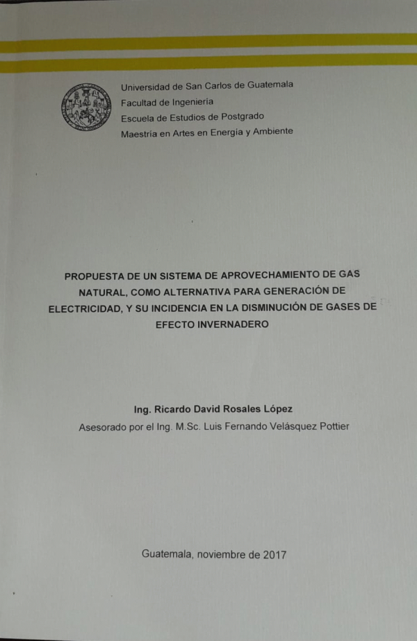 Propuesta de un sistema de aprovechamiento de gas natural, como alternativa para generación de electricidad, y su incidencia en la disminución de gases de efecto invernadero / Rosales López, Ricardo David